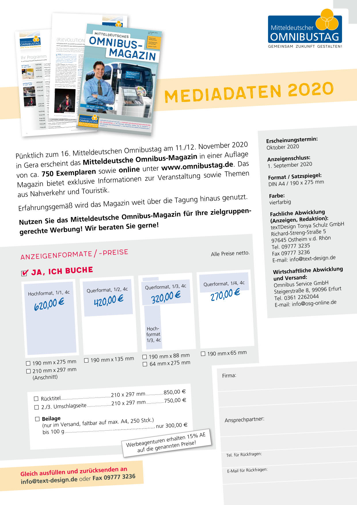 Das Magazin bietet exklusive Informationen zur Veranstaltung sowie Themen aus dem ÖPNV und der Bustouristik. Erfahrungsgemäß wird das Magazin weit über die Tagung hinaus genutzt. Nutzen Sie das Mitteldeutsche Omnibus-Magazin für Ihre zielgruppengerechte Werbung!